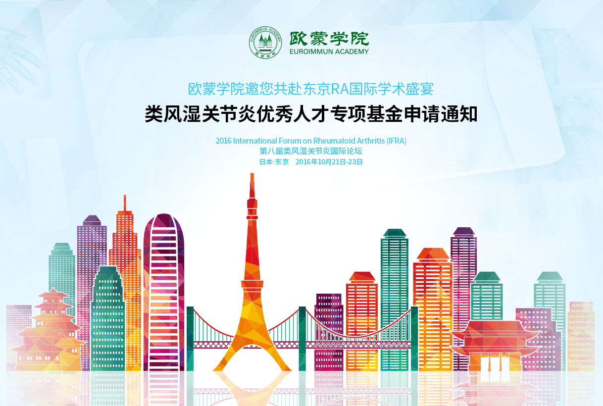 第八屆“類風(fēng)濕關(guān)節(jié)炎國際論壇(IFRA)”將于2016年10月21~23日在日本東京召開,該論壇為風(fēng)濕領(lǐng)域的國際性學(xué)術(shù)盛會(huì)。歐蒙學(xué)院秉承“分享前沿知識(shí),推動(dòng)醫(yī)學(xué)教育”的宗旨,以提高疾病的行業(yè)診斷水平為愿景,為推動(dòng)類風(fēng)濕關(guān)節(jié)炎(RA)疾病的醫(yī)療學(xué)術(shù)發(fā)展,特設(shè)立“歐蒙學(xué)院——類風(fēng)濕關(guān)節(jié)炎優(yōu)秀人才”專項(xiàng)基金,由歐蒙學(xué)院資助RA領(lǐng)域的優(yōu)秀人才赴東京參會(huì)。
