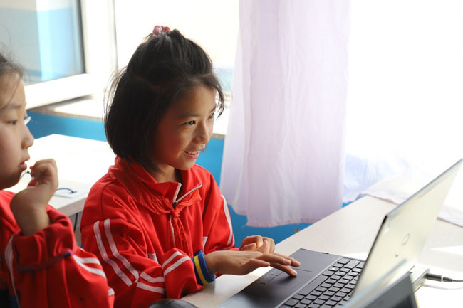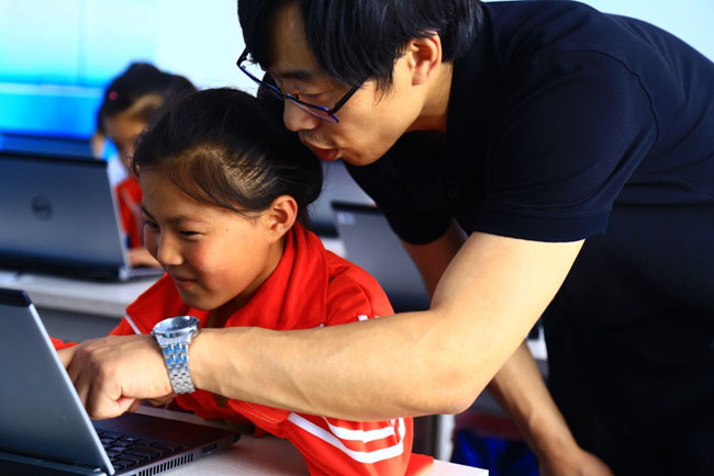 志愿者正在給孩子們上電腦課,這是他們第一次接觸電腦