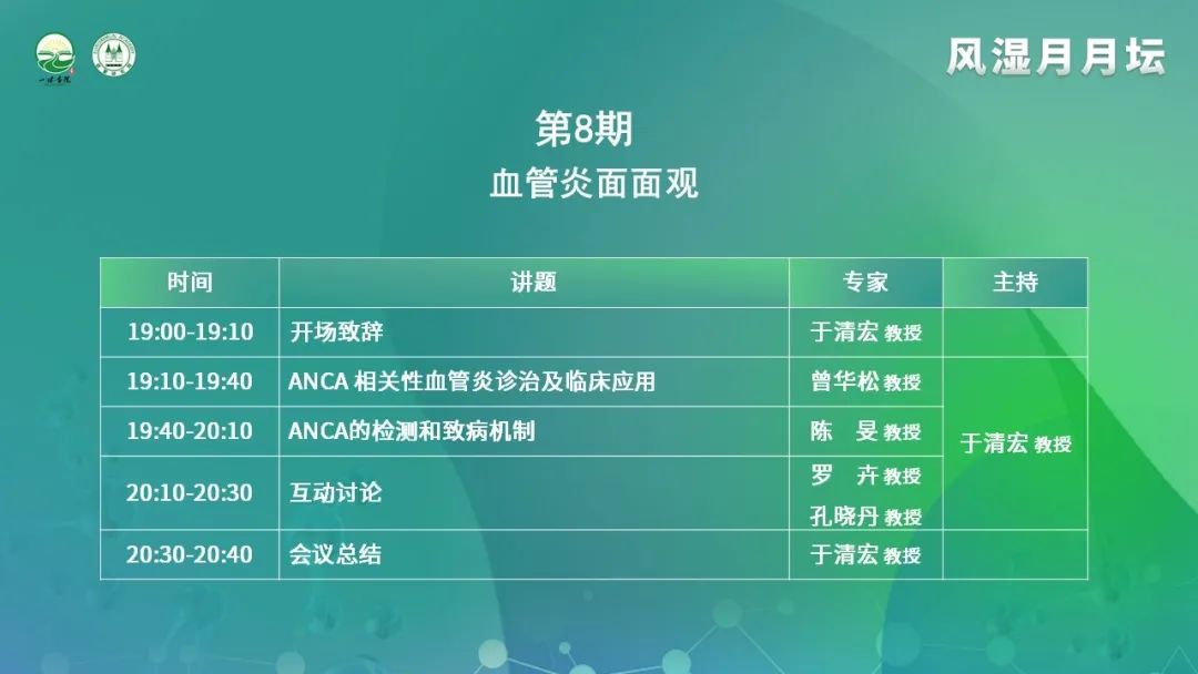 作為本次會(huì)議的大會(huì)主席,于清宏教授首先表示非常高興與各位同道、各位專家線上相見,參與到一味書院舉辦的第八期風(fēng)濕月月壇中,非常榮幸能夠以線上的形式與大家相聚,一同就ANCA相關(guān)性血管炎問題進(jìn)行探討。