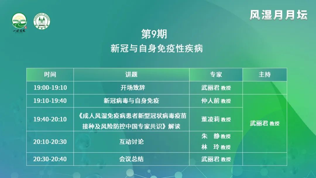 2023年4月17日(周一),由一味書院主辦的《風(fēng)濕月月壇(第9期)—新冠與自身免疫性疾病》于線上成功舉行。本次論壇由新疆維吾爾自治區(qū)人民醫(yī)院武麗君教授擔(dān)任大會(huì)主席,原上海長(zhǎng)征醫(yī)院仲人前教授、華中科技大學(xué)同濟(jì)醫(yī)學(xué)院附屬同濟(jì)醫(yī)院董凌莉教授作為講課嘉賓,四川省人民醫(yī)院朱靜教授、汕頭大學(xué)醫(yī)學(xué)院第一附屬醫(yī)院林玲教授作為本次大會(huì)的討論嘉賓。