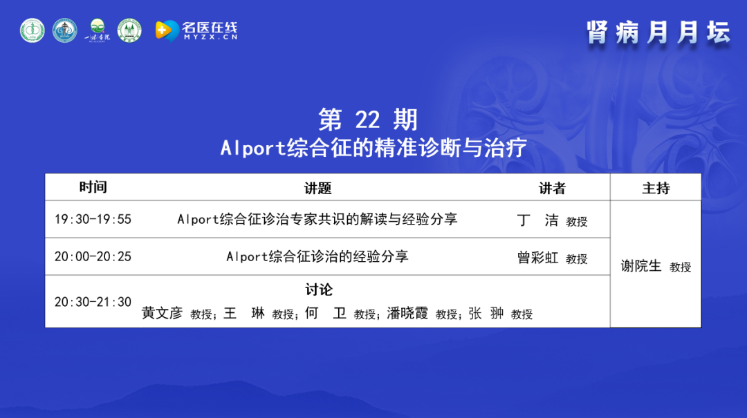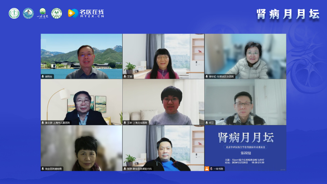 謝教授簡單介紹了“腎病月月壇”的歷史,“腎病月月壇”是在2022年5月疫情防控期間開始的線上學術交流活動,每個月第3周的周二晚上19:30-21:30開展,其形式是講座與討論相結合;論壇內容以臨床問題和臨床需求為導向,通過中醫(yī)和西醫(yī)的結合、腎科和其他學科的結合,以期提升腎臟病相關領域的診療水平。本期討論和交流的主要內容是Alport綜合征的精準診斷與治療,邀請的講者和討論嘉賓都是在該領域有很深造詣的專家,相信能為大家?guī)碛袃r值的內容。