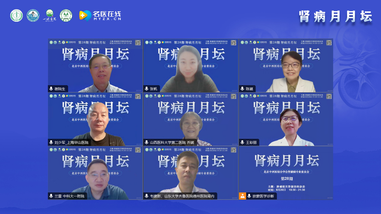 2024年8月20日,由北京中西醫(yī)結(jié)合學(xué)會(huì)腎臟病專(zhuān)業(yè)委員會(huì)舉辦的《腎病月月壇(第28期)——腫瘤相關(guān)腎損害的診治》于線(xiàn)上成功舉行。本次論壇由北京中西醫(yī)結(jié)合學(xué)會(huì)腎臟病專(zhuān)業(yè)委員會(huì)主任委員、北京中西醫(yī)結(jié)合腎臟疑難病會(huì)診中心主任、北京大學(xué)航天中心醫(yī)院腎內(nèi)科主任醫(yī)師特聘教授、解放軍總醫(yī)院及南開(kāi)大學(xué)醫(yī)學(xué)院博士生導(dǎo)師謝院生教授擔(dān)任大會(huì)主席,中山大學(xué)附屬第一醫(yī)院陳崴教授、解放軍總醫(yī)院張帆教授作為講課嘉賓,復(fù)旦大學(xué)附屬華山醫(yī)院劉少軍教授、山西醫(yī)科大學(xué)第二附屬醫(yī)院喬晞教授、包頭醫(yī)學(xué)院第一附屬醫(yī)院王彩麗教授、中國(guó)科學(xué)技術(shù)大學(xué)附屬第一醫(yī)院(安徽省立醫(yī)院)蘭雷教授以及山東大學(xué)齊魯醫(yī)院德州醫(yī)院韋建新教授作為本次大會(huì)的討論嘉賓。