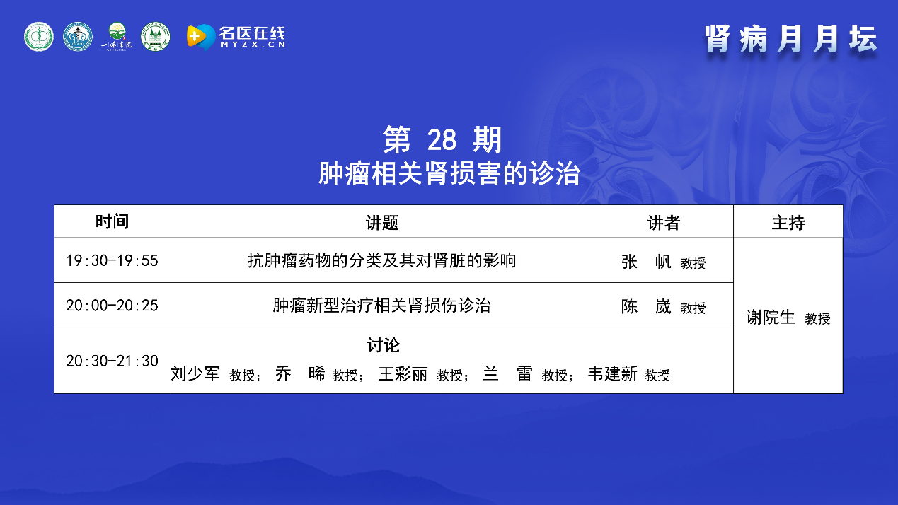 今天的主題是腫瘤相關(guān)腎損害的診治,很榮幸邀請(qǐng)到了在該領(lǐng)域有很深造詣的專(zhuān)家,一起進(jìn)行學(xué)術(shù)講座、點(diǎn)評(píng)與討論。