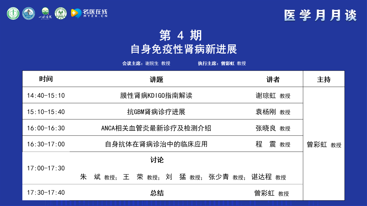 首先感謝謝院生教授精心組織醫(yī)學月月談,其次感謝四位講者為本次論壇做的精心準備。本次論壇四位講者對膜性腎病、抗GBM病、ANCA相關(guān)血管炎及自身抗體在足細胞病中的應用進行了發(fā)病機制、診斷、治療的介紹,五位討論嘉賓對講者的內(nèi)容提出了自己的觀點,同時也對臨床上存在的問題和講者之間進行了討論和交流。目前醫(yī)學月月談系列活動共進行了30多期,期盼后面的內(nèi)容更加精彩。