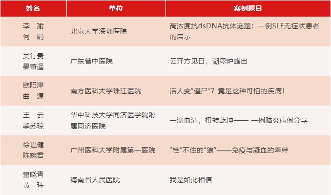參與此次南部區(qū)域展示的案例覆蓋風(fēng)濕科、腎臟內(nèi)科、兒科、神經(jīng)內(nèi)科四大臨床學(xué)科。活動現(xiàn)場邀請到多位檢驗(yàn)和臨床多學(xué)科專家,從臨床思維、專業(yè)水平和綜合能力等方面對案例進(jìn)行指導(dǎo)。出席本次活動的專家有:北京大學(xué)深圳醫(yī)院腎內(nèi)科熊祖應(yīng)教授、廣州醫(yī)科大學(xué)附屬婦女兒童醫(yī)療中心風(fēng)濕免疫科周娟教授、華中科技大學(xué)同濟(jì)醫(yī)學(xué)院附屬協(xié)和醫(yī)院風(fēng)濕免疫科李秋柏教授、武漢市中心醫(yī)院檢驗(yàn)科盧忠心教授、中南大學(xué)湘雅醫(yī)院神經(jīng)內(nèi)科唐薇婷教授、湖南省人民醫(yī)院檢驗(yàn)科袁浩教授、惠州市第三人民醫(yī)院檢驗(yàn)科黎村艷教授、惠州市中心人民醫(yī)院風(fēng)濕科莊宇教授、柳州市工人醫(yī)院檢驗(yàn)科劉立民教授、海南省人民醫(yī)院檢驗(yàn)科符克英教授;湖北省人民醫(yī)院夏尊恩教授、普寧市人民醫(yī)院潘美靖教授擔(dān)任主持嘉賓。