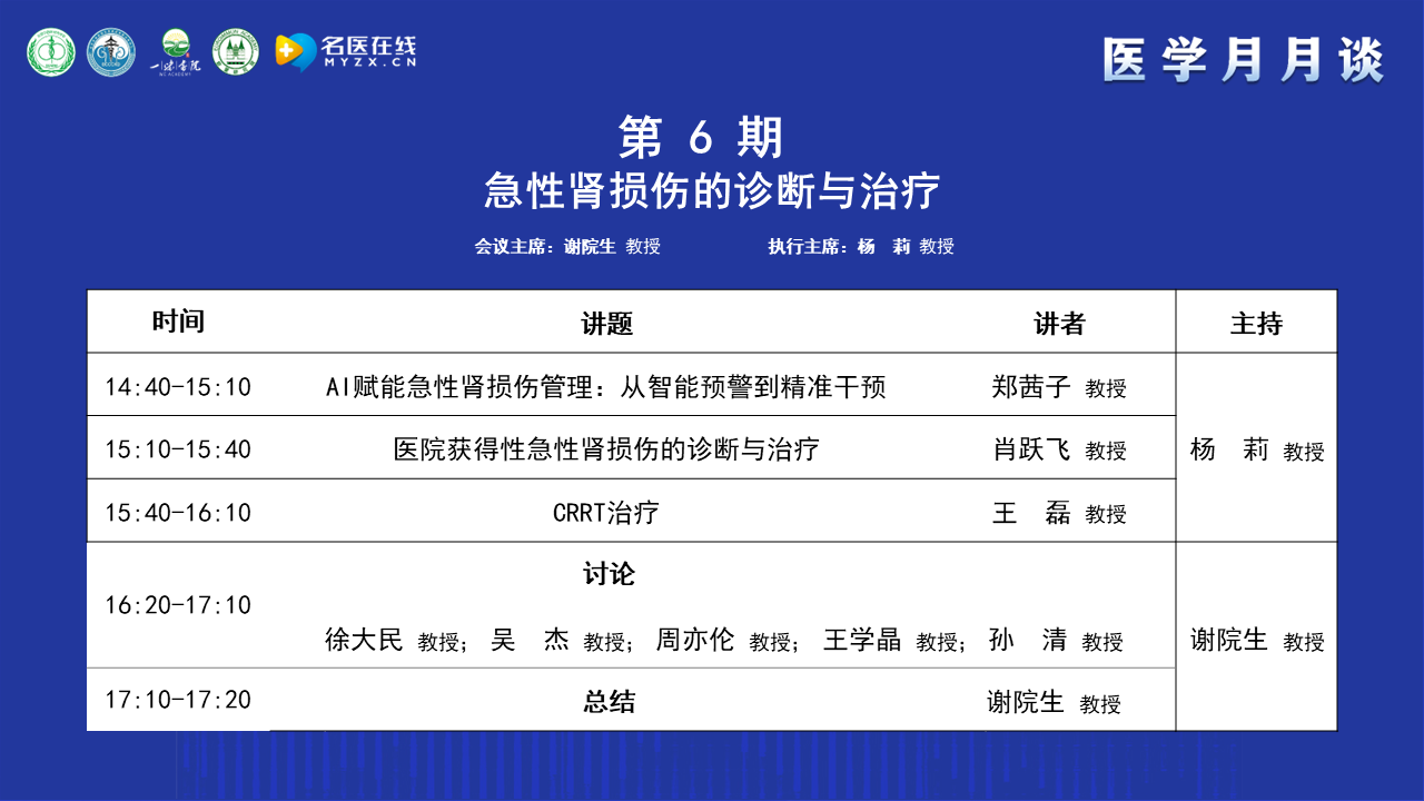 謝教授簡單介紹了“醫學月月談”的前身“腎病月月壇”的歷史,“腎病月月壇”是在疫情防控期間開展的線上學術交流活動,以腎臟病或系統性疾病腎損害的診治為主,每期一個主題,形式和內容都很受歡迎。為了讓更多的人受益,升級為“醫學月月談”。“醫學月月談”是一個以臨床需求為導向,以解決臨床問題為目的,線下和線上相結合的醫學交流活動。本期醫學月月談的主題是急性腎損傷,非常榮幸的邀請到在急性腎損傷研究領域非常著名的楊莉教授作為本期的執行主席,相信本期月月談將在楊教授的引導下,在各位專家們的大力支持下,取得圓滿成功。