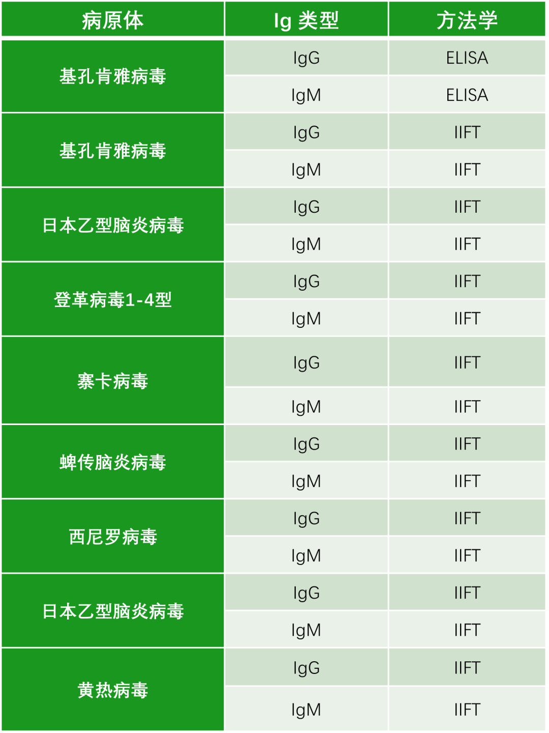 - IgG陽性結果,表明曾受到基孔肯雅病毒感染;恢復期血清抗體滴度比急性期抗體滴度有4倍或4倍以上升高則可確診。