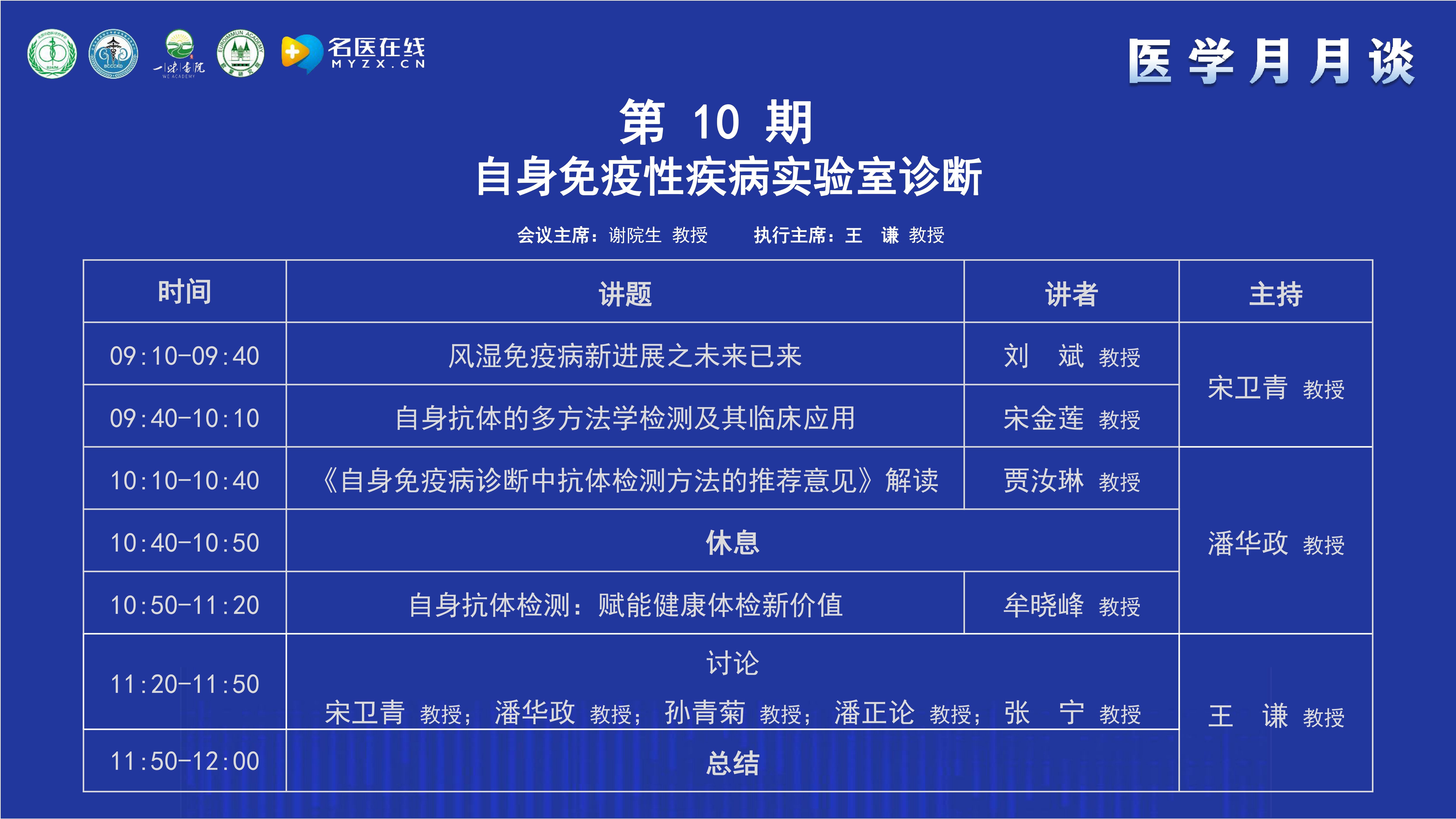 謝教授簡單介紹了“醫(yī)學月月談”的前身“腎病月月壇”的歷史,“腎病月月壇”是在疫情防控期間開展的線上學術交流活動,以腎臟病或系統(tǒng)性疾病腎損害的診治為主,每期一個主題,形式和內容都很受歡迎。為了讓更多的人受益,升級為“醫(yī)學月月談”。“醫(yī)學月月談”秉承“腎病月月壇”的優(yōu)良傳統(tǒng),聚焦醫(yī)學工作的熱點和難點,以臨床需求為導向,以解決臨床問題為目的,每月主辦1-2次線下和線上相結合的醫(yī)學交流活動,線下在全國的城市輪流舉辦,已相繼在北京、沈陽、上海、南京、武漢、福州、新疆等地成功舉辦9期醫(yī)學月月談。本期醫(yī)學月月談的主題是自身免疫性疾病實驗室診斷,非常榮幸的邀請到山東大學齊魯醫(yī)院王謙教授作為本期的執(zhí)行主席,相信本期月月談將在王教授的引導下,在各位專家們的大力支持下,取得圓滿成功。